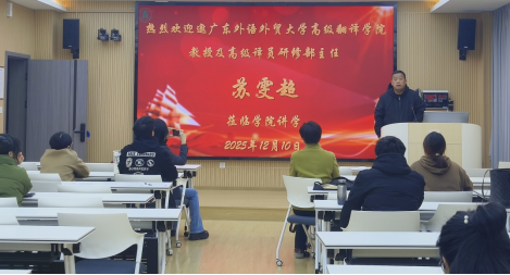 12月10日,广东外语外贸大学苏雯超教授应学院邀请,为学院师生作题为“人工智能时代的认知口译研究”的学术讲座。本次讲座在逸夫人文楼A3014举行,由翻译与跨文化传播研究所所长韩晓龙博士主持。